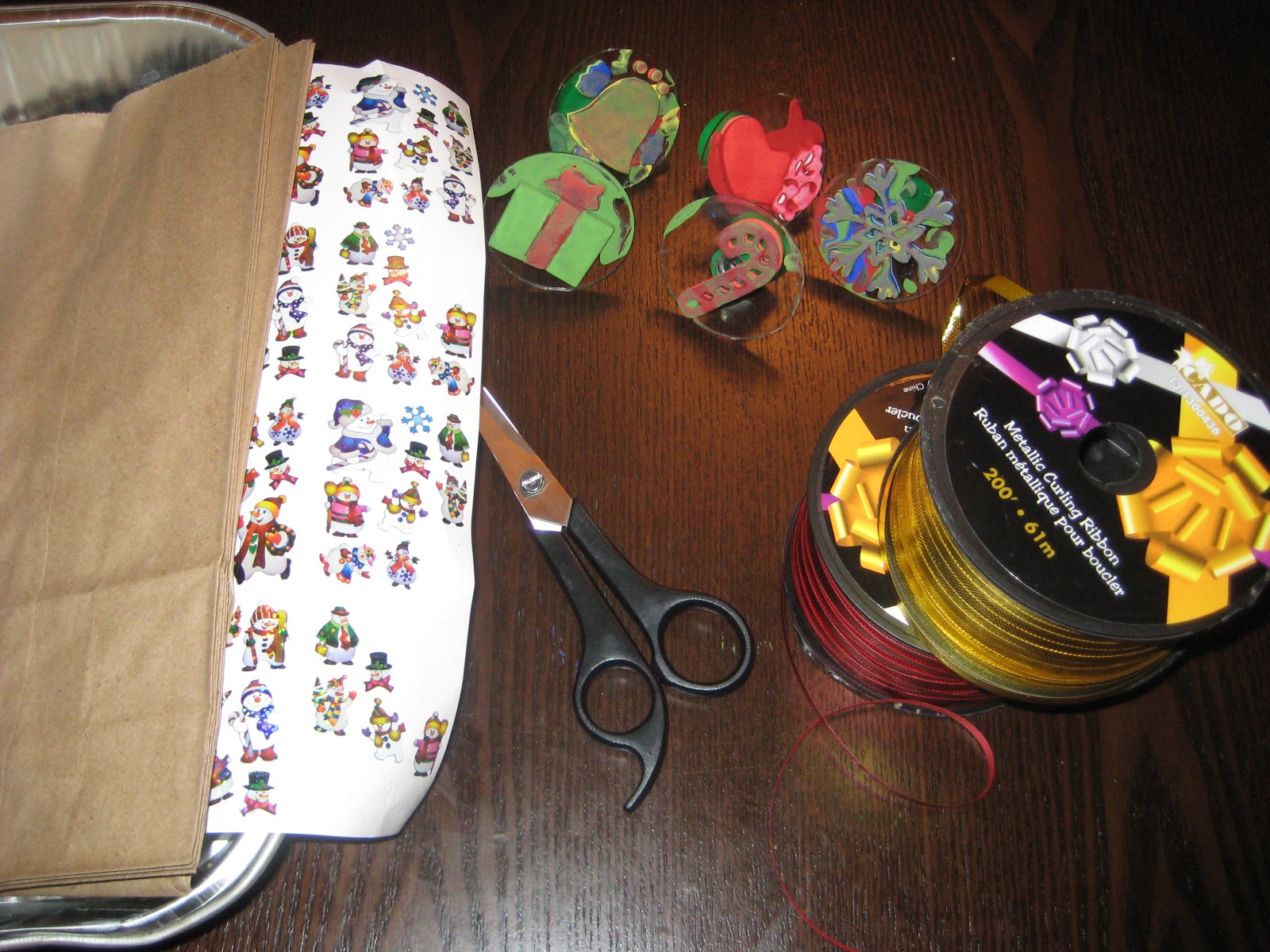 Take two long pieces of ribbon and slide through the hole. Tie it on top as a bow. Then if you want, take the ends of the ribbon and curl them with scissors.